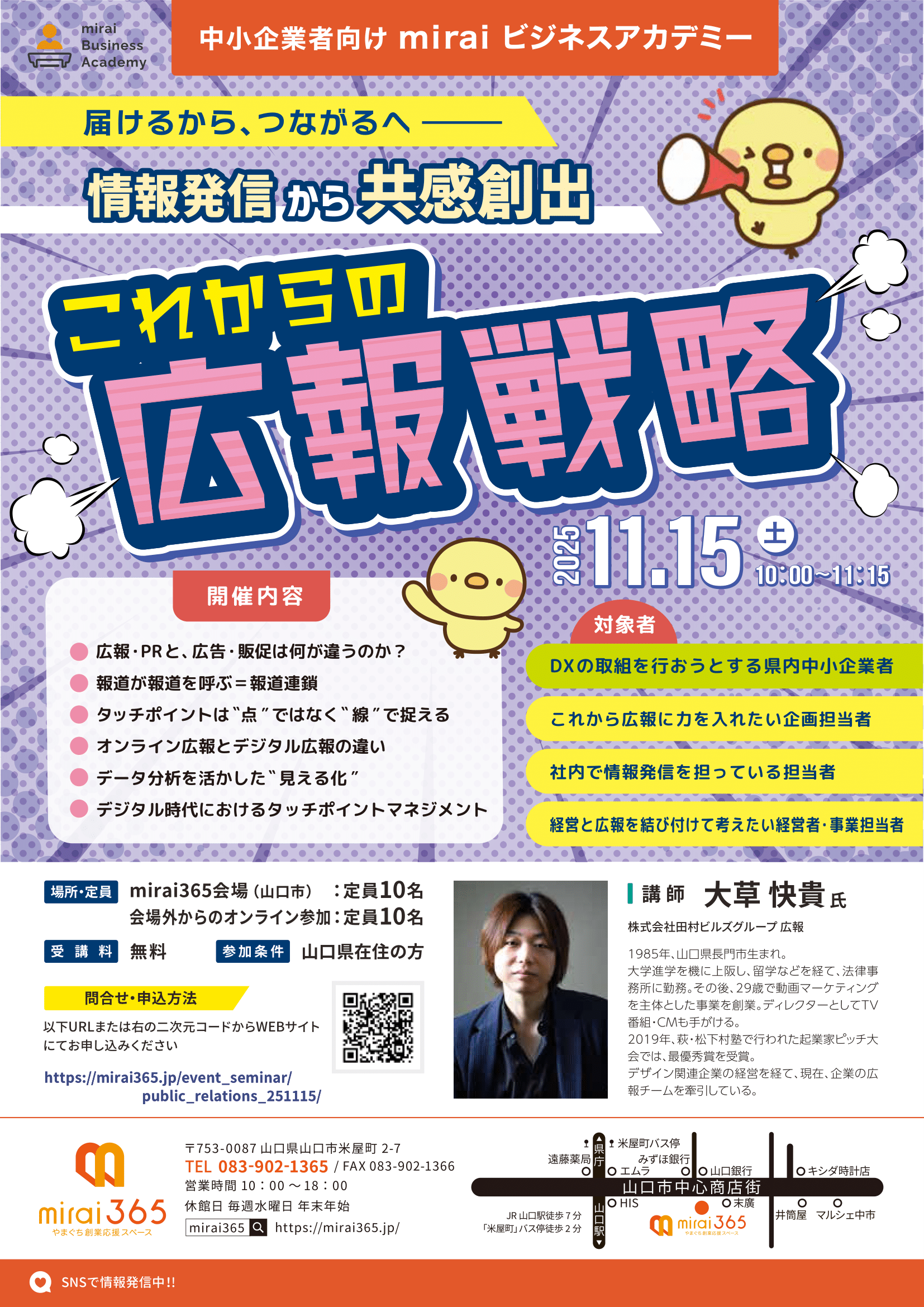 この度山口市米屋町商店街の中にある『mirai365』さん主催のセミナーに弊社社員が登壇いたします!