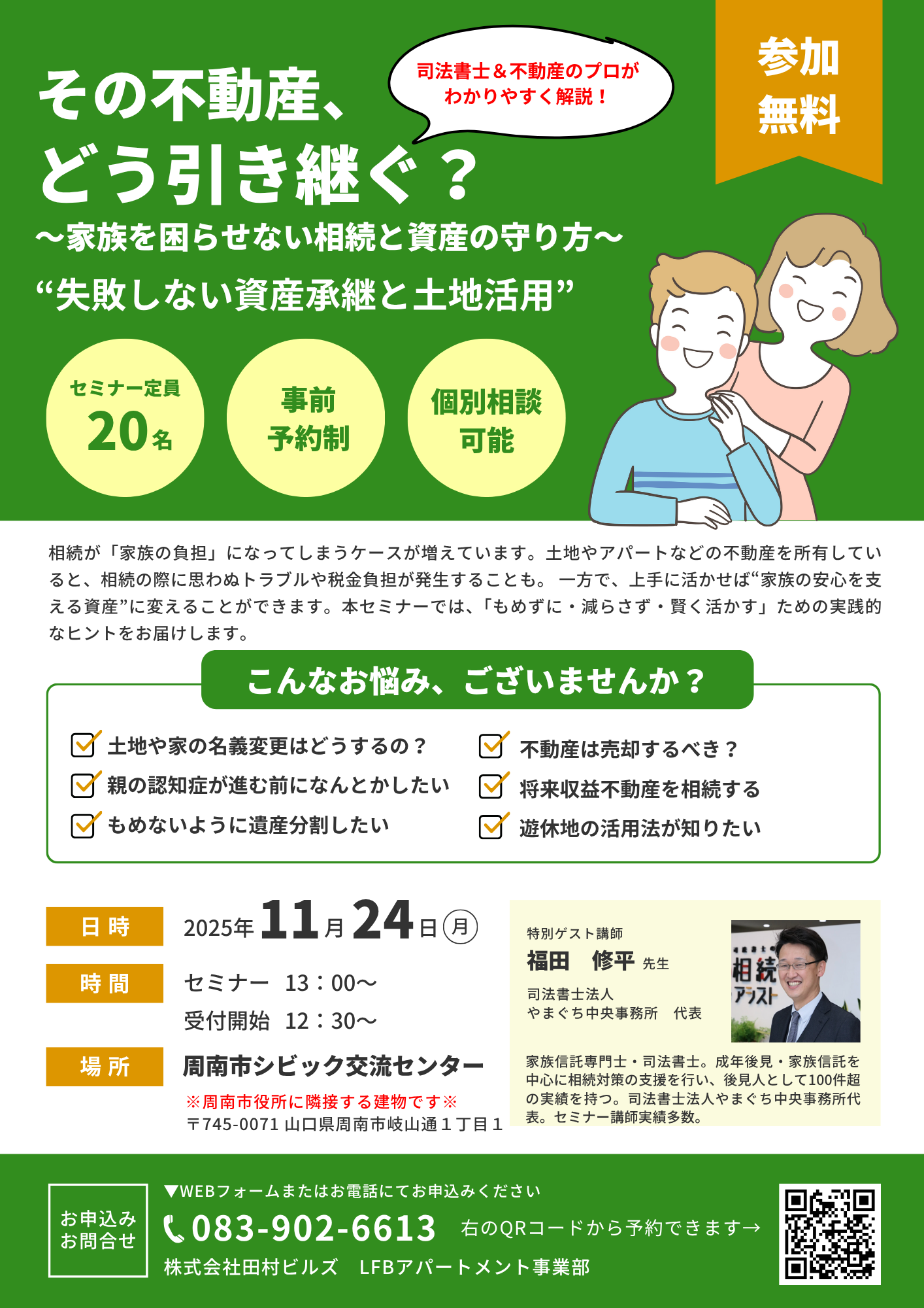 家族信託専門士・家族信託コーディネーター。平成12年亜細亜大学法学部卒業後、平成16年に司法書士試験合格。平成17年に福田修平司法書士事務所を開業。平成20年に司法書士法人やまぐち中央事務所を設立。開業当初より成年後見に積極的に取り組み、これまで100件を超える成年後見人就任実績がある。本年度より家族信託に積極的に取り組み、ハウスメーカーや銀行主催のセミナー講師実績多数。