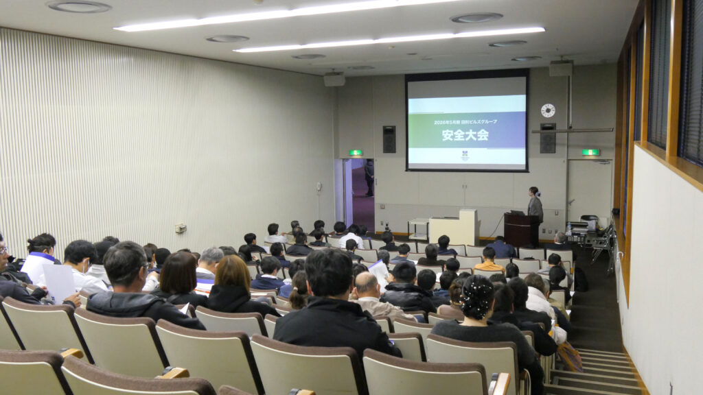 この安全大会は年に2回開催しており、労働災害などを防止するため、安全意識を高める活動の定着を目的としています。