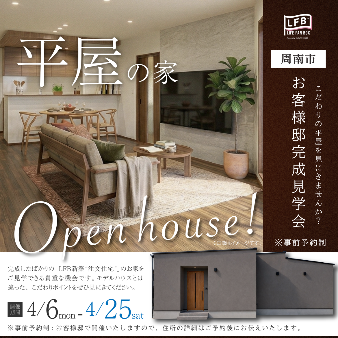 田村ビルズ(LFB新築住宅)では、4月6日(月)より山口県周南市にて、実際にお客さまが建てられた注文住宅(平屋)の完成見学会を期間限定で開催いたします。