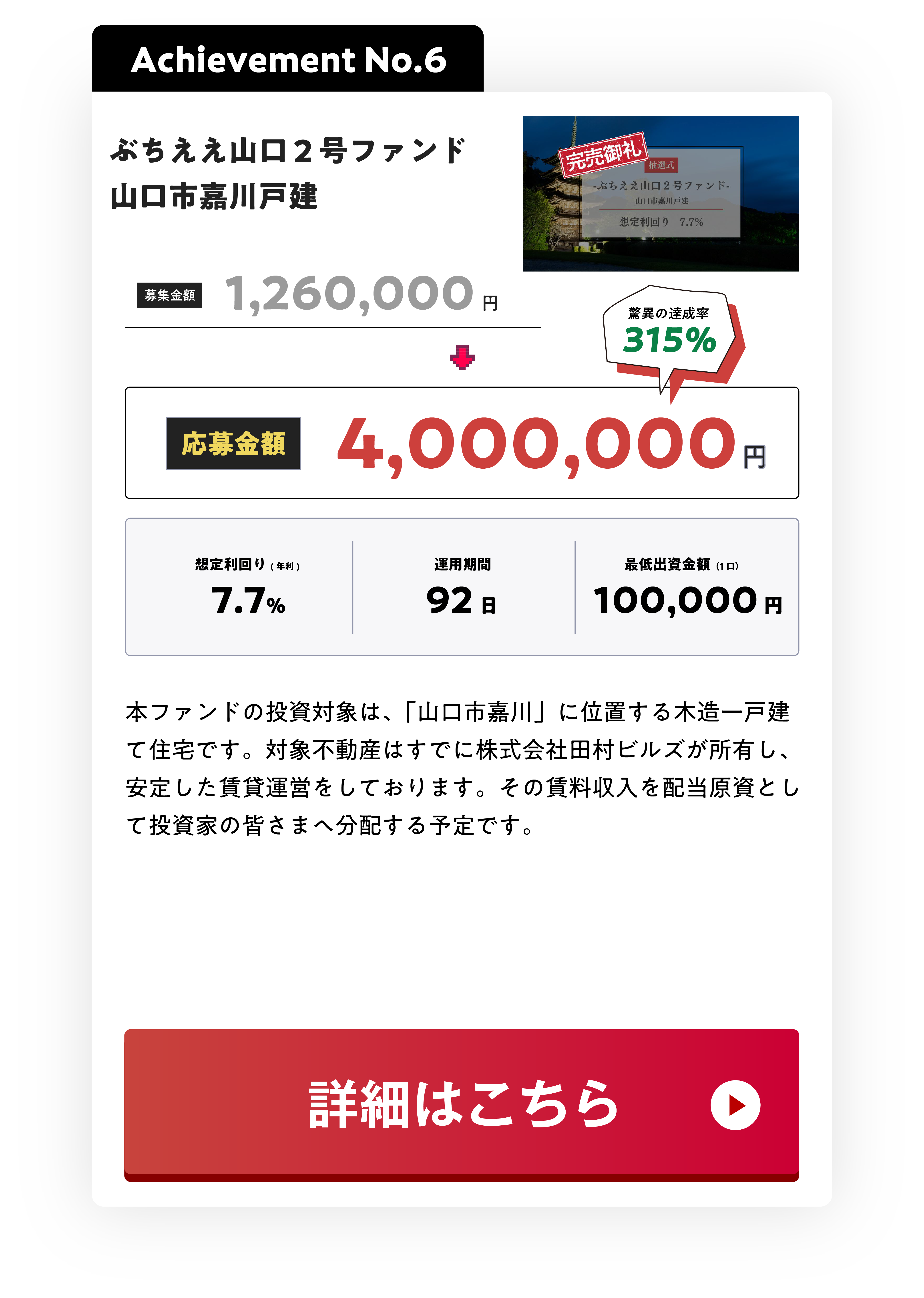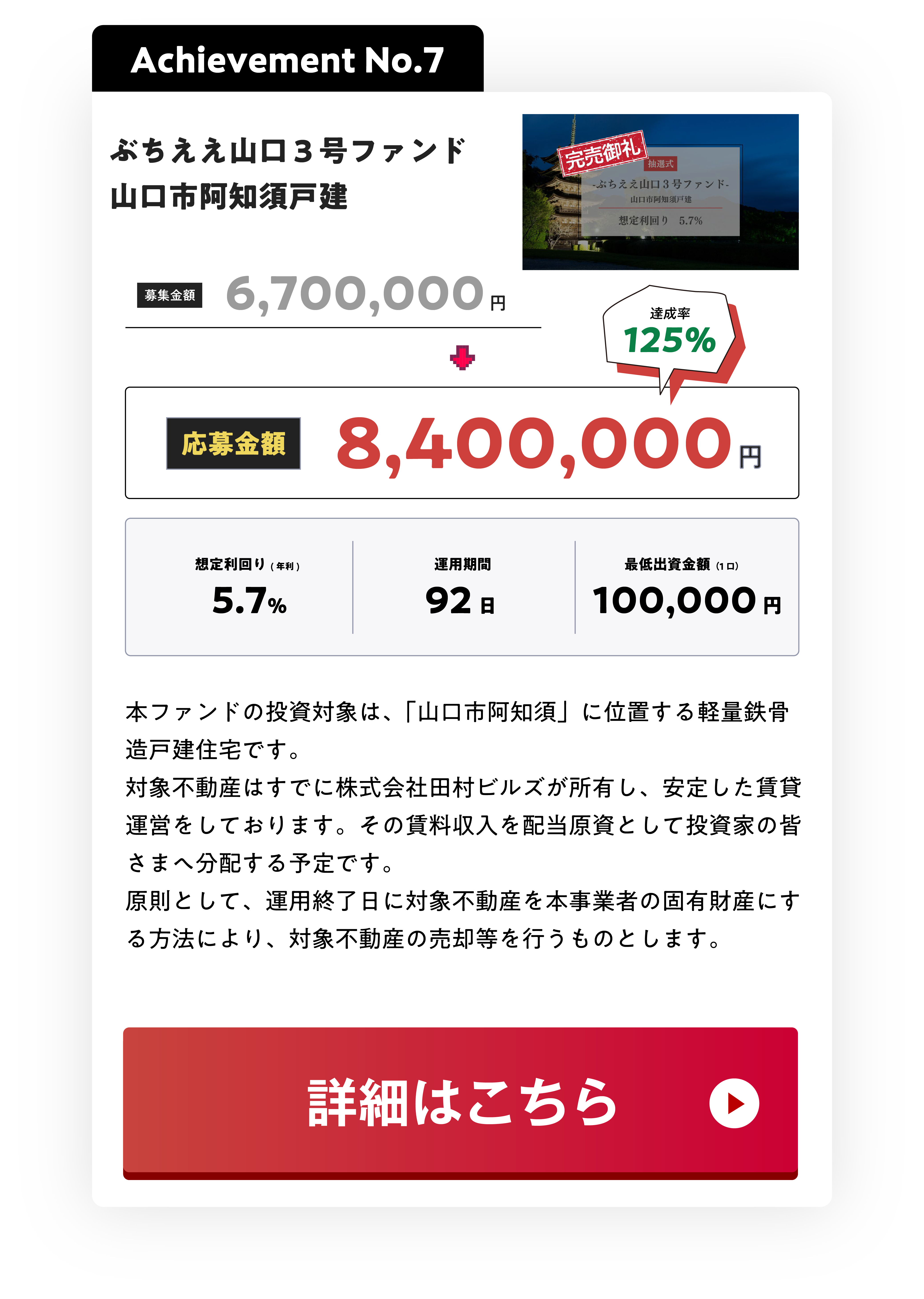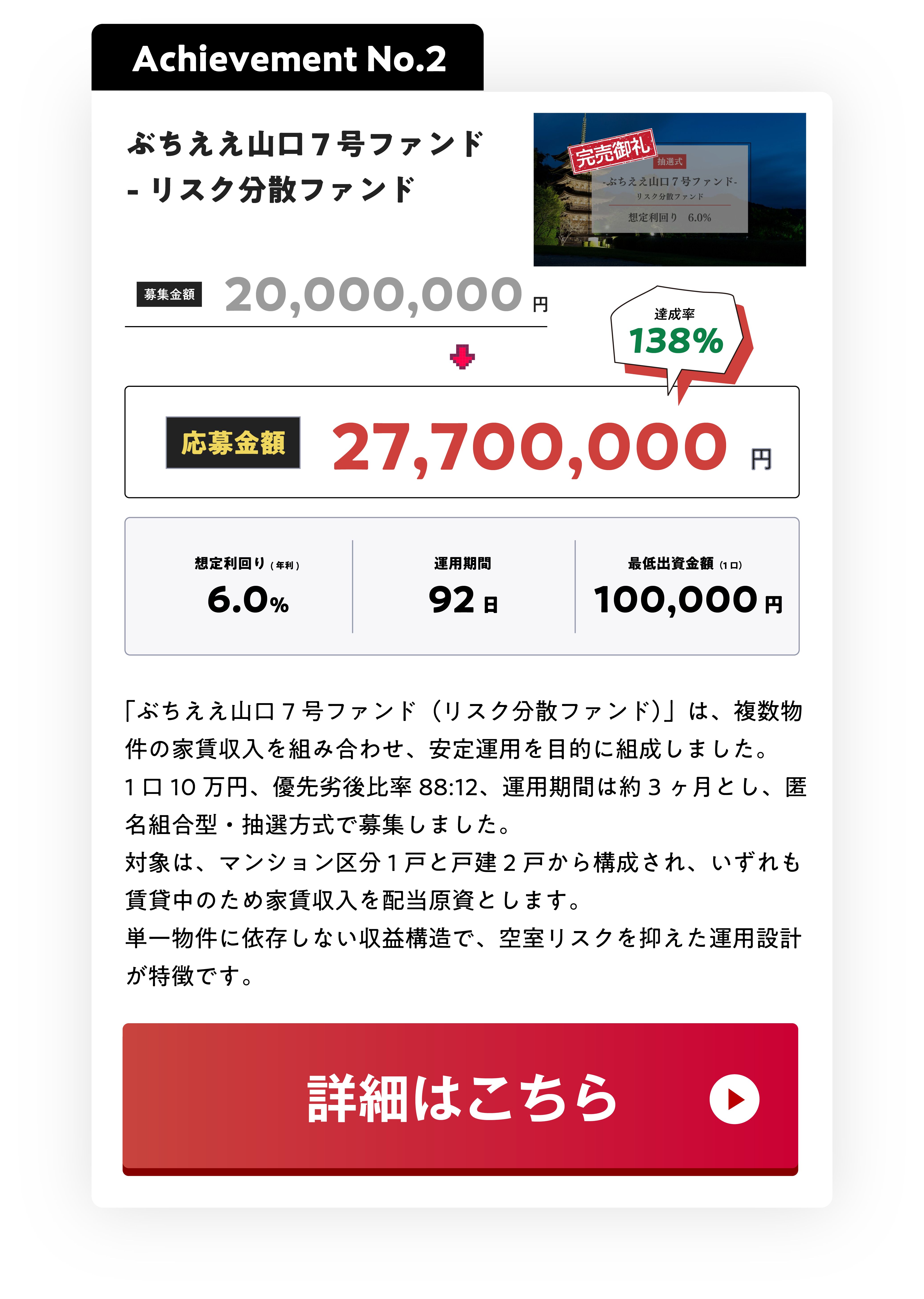 ・プロジェクトが完了し、当社からお客様に元本+配当を償還する際の振込手数料は、当社負担となります。